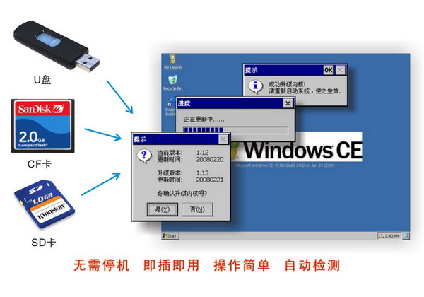 適用于WinCE 5.0操作系統(tǒng),自定義升級方式,在系統(tǒng)升級設(shè)計,使用U盤/CF卡/SD卡實現(xiàn)升級,無需專用設(shè)備。