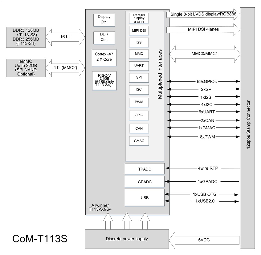 l 支持128-256M Bytes DDR3 SDRAM(處理器內(nèi)置,不可擴(kuò)展,T113-S3內(nèi)置128MB; T113-S3內(nèi)置256MB;);
