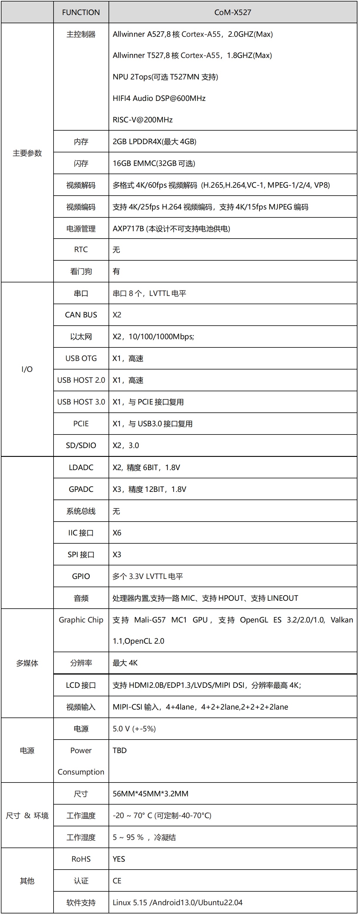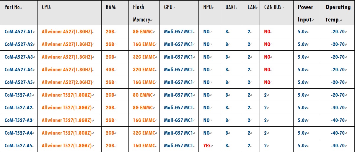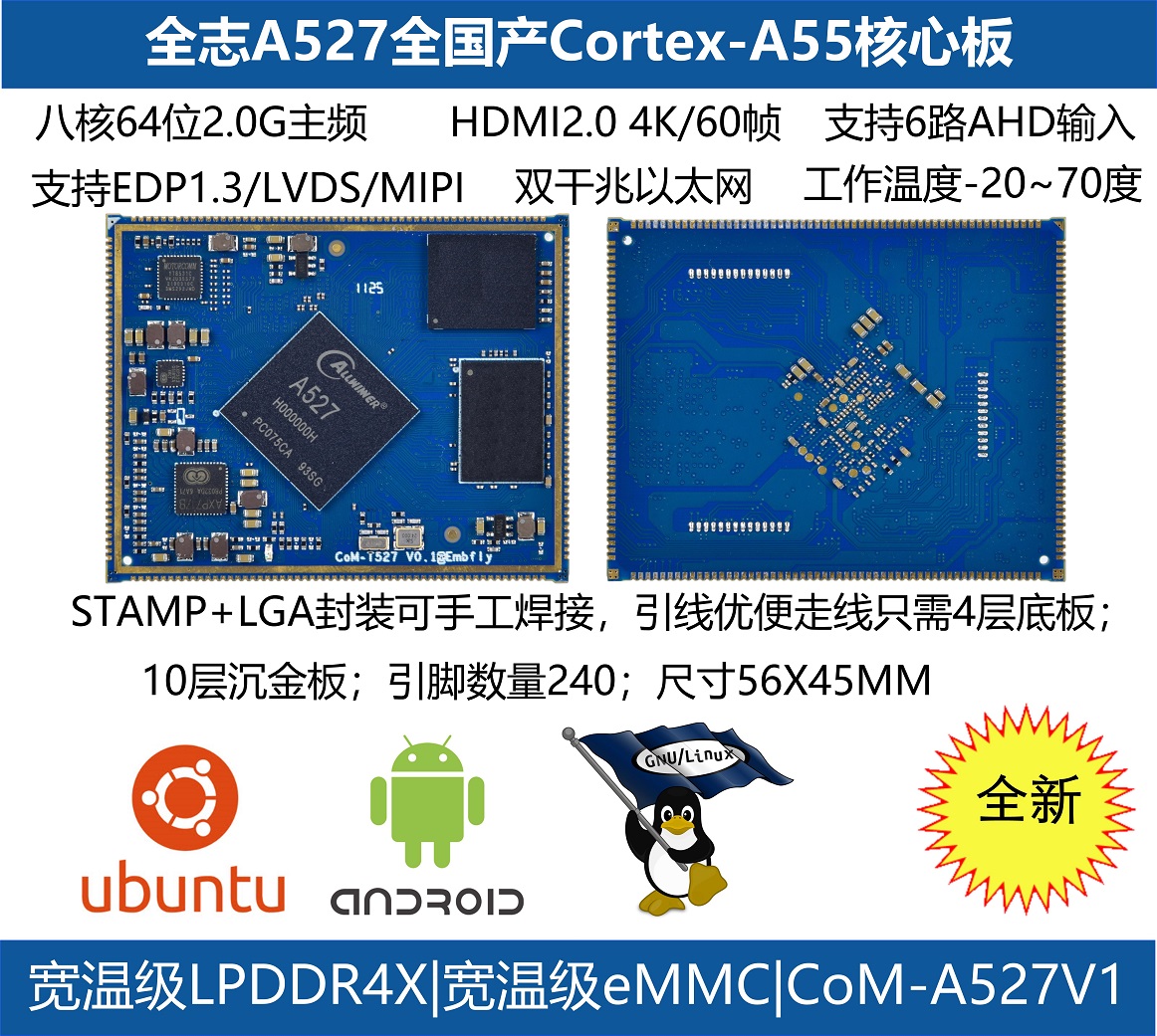 CoM-X527核心模塊屬于盈鵬飛嵌入式Computer-on-Module系列,該產(chǎn)品集成了八核 Cortex-A55 2.0GHz(MAX) A527處理器或者T527車規(guī)級處理器,穩(wěn)定運(yùn)行Android 13.0/Ubuntu 22.04/Linux 5.15。CoM-X527可提供雙千兆以太網(wǎng)接口;支持MIPI-CSI輸入,4+4lane,4+2+2lane,2+2+2+2lane;支持10路串口;支持HDMI2.0B/EDP1.3/LVDS/MIPI DSI顯示;特定型號還支持2TOPS的NPU, 為圖像處理及畫質(zhì)增強(qiáng)等AI應(yīng)用提供了性能支持;它還還提供了3.3V I/O接口,可提供寬溫的工業(yè)組件,運(yùn)行于條件惡劣的工業(yè)現(xiàn)場!該產(chǎn)品可應(yīng)用于智能座艙、輔助駕駛、智慧工業(yè)、行業(yè)智能、智能電網(wǎng)等領(lǐng)域,我司提供各種參考設(shè)計(jì)。