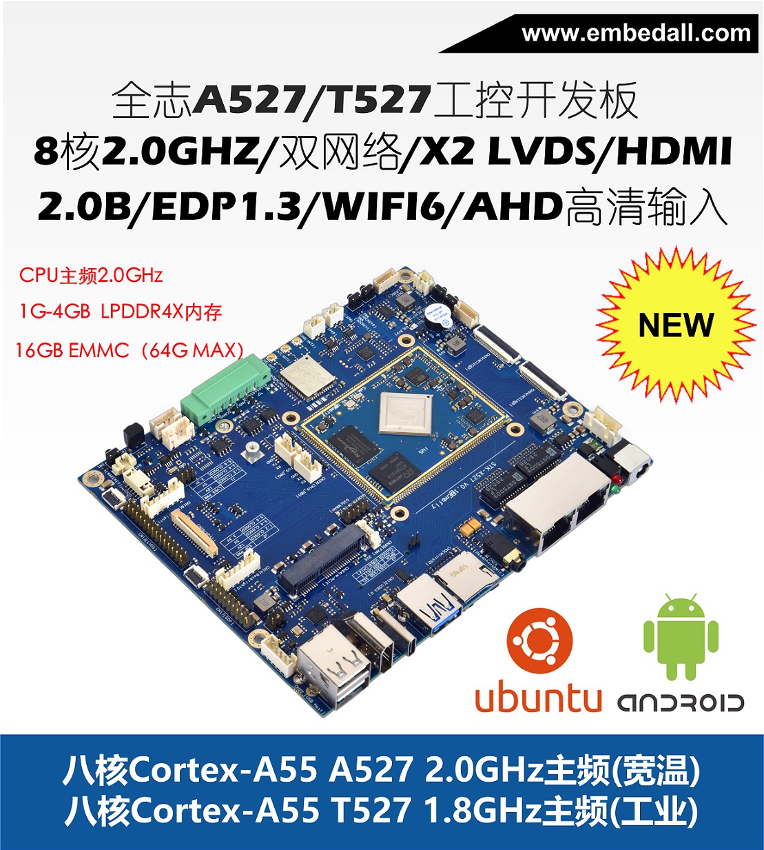 l 采用Allwinner公司Cortex-A55八核A527/T527處理器,最高速度為2.0GHZ;