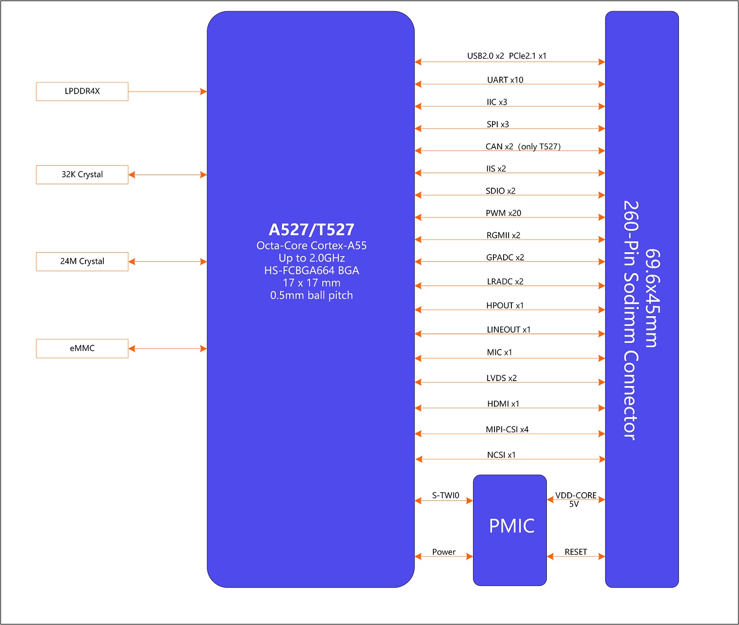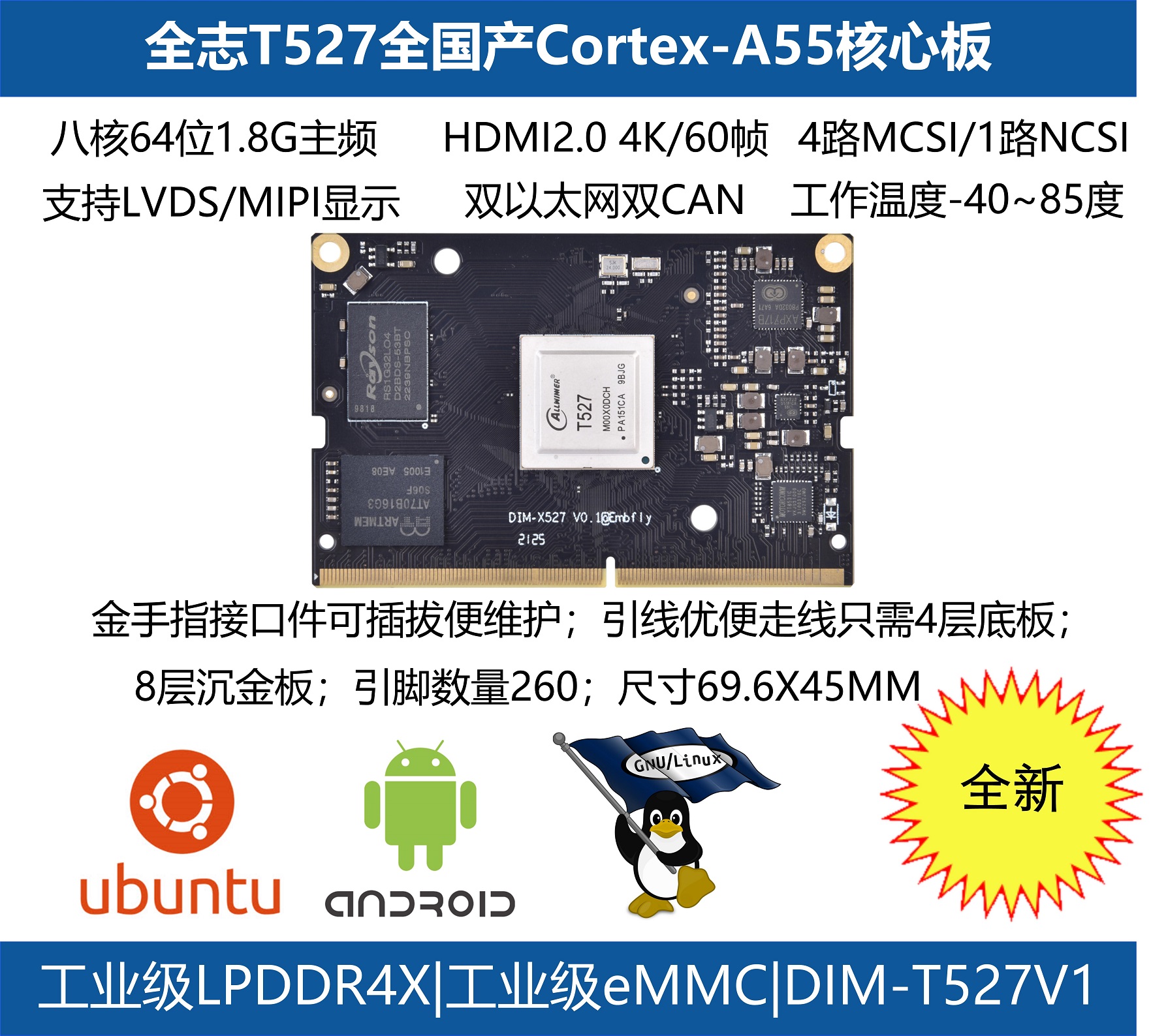 DIM-X527核心模塊屬于盈鵬飛嵌入式Computer-on-Module系列,該產(chǎn)品集成了八核 Cortex-A55 2.0GHz(MAX) A527處理器或者T527車規(guī)級處理器,穩(wěn)定運行Android 13.0/Ubuntu 22.04/Linux 5.15。