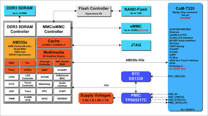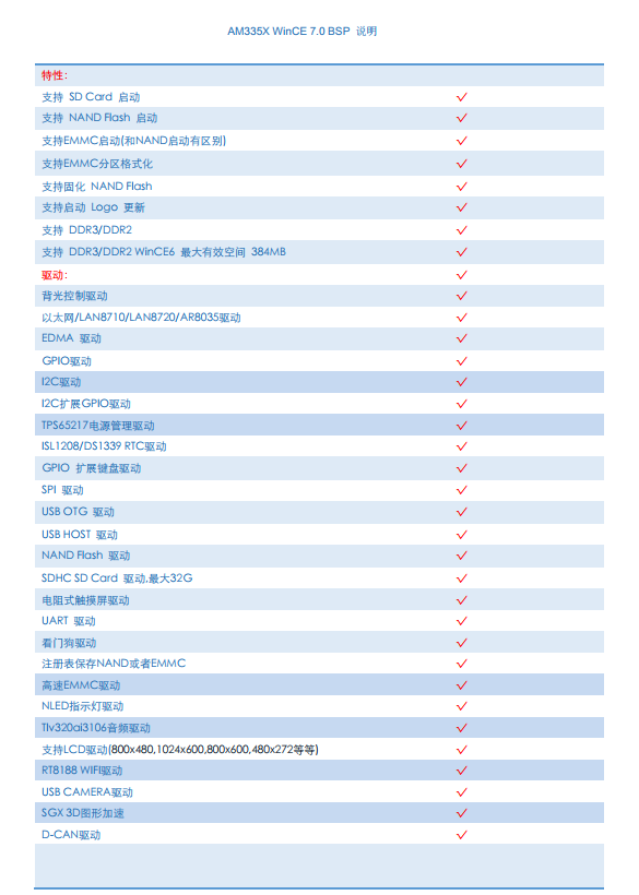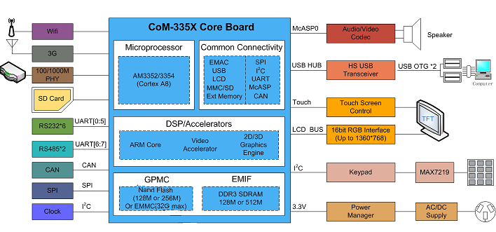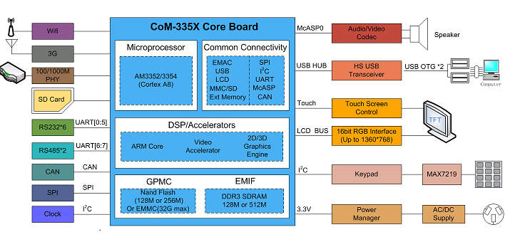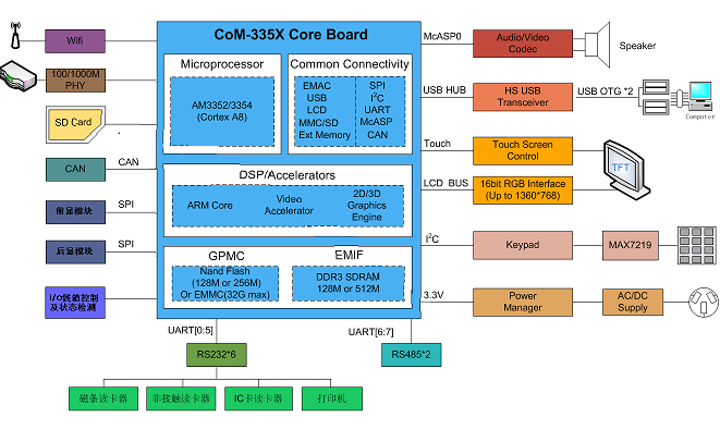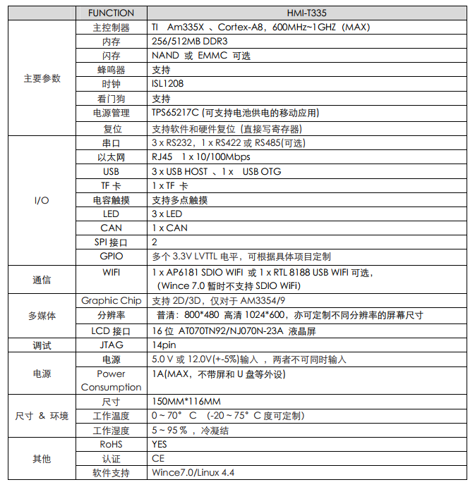 產(chǎn)品特性 1.采用TI公司Cortex-A8 AM335X作為主控,運(yùn)行速度高達(dá)1GHZ,工業(yè)級(jí)處理器,工作穩(wěn)定可靠。 2.啟動(dòng)媒介可選EMMC或NAND,Wince7.0從上電到出現(xiàn)應(yīng)用程序可在15秒內(nèi)完成。 3.整體采用AM335x(CoM-T335 v1.1)核心模塊實(shí)現(xiàn),便于快速定制,最快可一個(gè)月實(shí)現(xiàn)應(yīng)用。 4.可提供Wince 7.0和linux 4.4兩套操作系統(tǒng),提供大量的應(yīng)用源代碼,例如:wince 7.0可提供C++、C#等例子,Linux例子程序有中文操作、串口操作、CAN BUS通信等... 5.實(shí)現(xiàn)穩(wěn)定的電容屏多點(diǎn)觸控,讓操作更流暢。 6.支持高清和普清兩款液晶屏,分辨率分別是1024*600和800*480, 客戶可以隨意選擇,亦可定制不同款液晶屏。 7.引出JTAG接口,可直接仿真單任務(wù)程序,讓客戶快速調(diào)試。 8.整個(gè)系統(tǒng)可根據(jù)用戶要求可隨意變換主板結(jié)構(gòu),可快速實(shí)現(xiàn)應(yīng)用,如需定制,可聯(lián)系email:info@embedall.com。 9.15年項(xiàng)目應(yīng)用定制經(jīng)驗(yàn),讓客戶更放心,更省心。 HMI-T335是基于AM335x(CoM-T335v1.1)核心模塊的人機(jī)界面(可定制寬溫)工控主板,穩(wěn)定運(yùn)行Wince7.0或Linux4.4系統(tǒng)。支持4串口(3路RS232、1路RS422或RS485)、CAN總線、電容屏多點(diǎn)觸摸、WIFI、JTAG、百兆以太網(wǎng)等??梢詮V泛用于控制現(xiàn)場(chǎng)、路橋控制收費(fèi)系統(tǒng)、醫(yī)療儀器、POS柜臺(tái)收銀機(jī)、數(shù)控機(jī)床、環(huán)境保護(hù)監(jiān)測(cè)等領(lǐng)域。 CoM-T335v1.1工控模塊產(chǎn)品集成了 ARM Cortex-A8 1GHz(MAX) TI AM335X 處理器,穩(wěn)定運(yùn)行Wince 7.0 和Linux 4.4。 CoM-T335v1.1提供了3.3V I/O接口,可定制寬溫的工業(yè)組件,運(yùn)行于條件惡劣的工業(yè)現(xiàn)場(chǎng)! 產(chǎn)品參數(shù) 功能框圖 支持軟件 Wince 7.0相關(guān)驅(qū)動(dòng) CoM-T335 v1.1亮點(diǎn) Cortex-A8郵票孔AM335X核心模塊,精設(shè)計(jì),低成本,可信賴 ◆ 高速Cortex-A8核心,最高運(yùn)行1GHZ; ◆ 單顆256M/512M字節(jié)DDR3 SDRAM,成本更低廉; ◆ 大容量板載電子盤,更多用戶空間; ◆ 精致郵票孔設(shè)計(jì),超小尺寸40mm*40mm,批量使用成本更低; ◆ 1路10M/100M/1000M以太網(wǎng); ◆ 核心板獨(dú)立RTC, 走時(shí)精準(zhǔn); ◆ 最優(yōu)秀的顯示性能,分辨率高達(dá)1366*768; ◆ CPU內(nèi)置6路RS232串口(其中1路232為COM_DBU); ◆ 外部擴(kuò)展3*IIC,2*SPI接口; ◆ CPU內(nèi)置雙路CAN BUS,適合于現(xiàn)場(chǎng)工業(yè)控制; ◆ 支持SD卡接口,大容量存儲(chǔ); ◆ 高速USB 2.0 OTG接口; ◆引出JTAG接口(V1.1版本硬件,4線電阻觸摸屏),便于裸機(jī)系統(tǒng)調(diào)試。 ◆EMMC啟動(dòng)版本兼容BeagleboneBlack。 ◆ 專業(yè)WINCE 7.0、LINUX 4.4、ANDROID操作系統(tǒng)支持, ◆支持SD卡初始化系統(tǒng),可USB盤升級(jí)系統(tǒng); ◆ 核心板高集成度,可以直接應(yīng)用,可根據(jù)客戶定制主板; AM335x框圖 CoM-T335v1.1實(shí)物圖 CoM-T335v1.1尺寸(40mm x 40mm) CoM-T335v1.1應(yīng)用領(lǐng)域: 應(yīng)用案例1-POS機(jī) 應(yīng)用案例2-監(jiān)護(hù)儀 應(yīng)用案例3-人機(jī)界面 AM335x人機(jī)界面解決方案